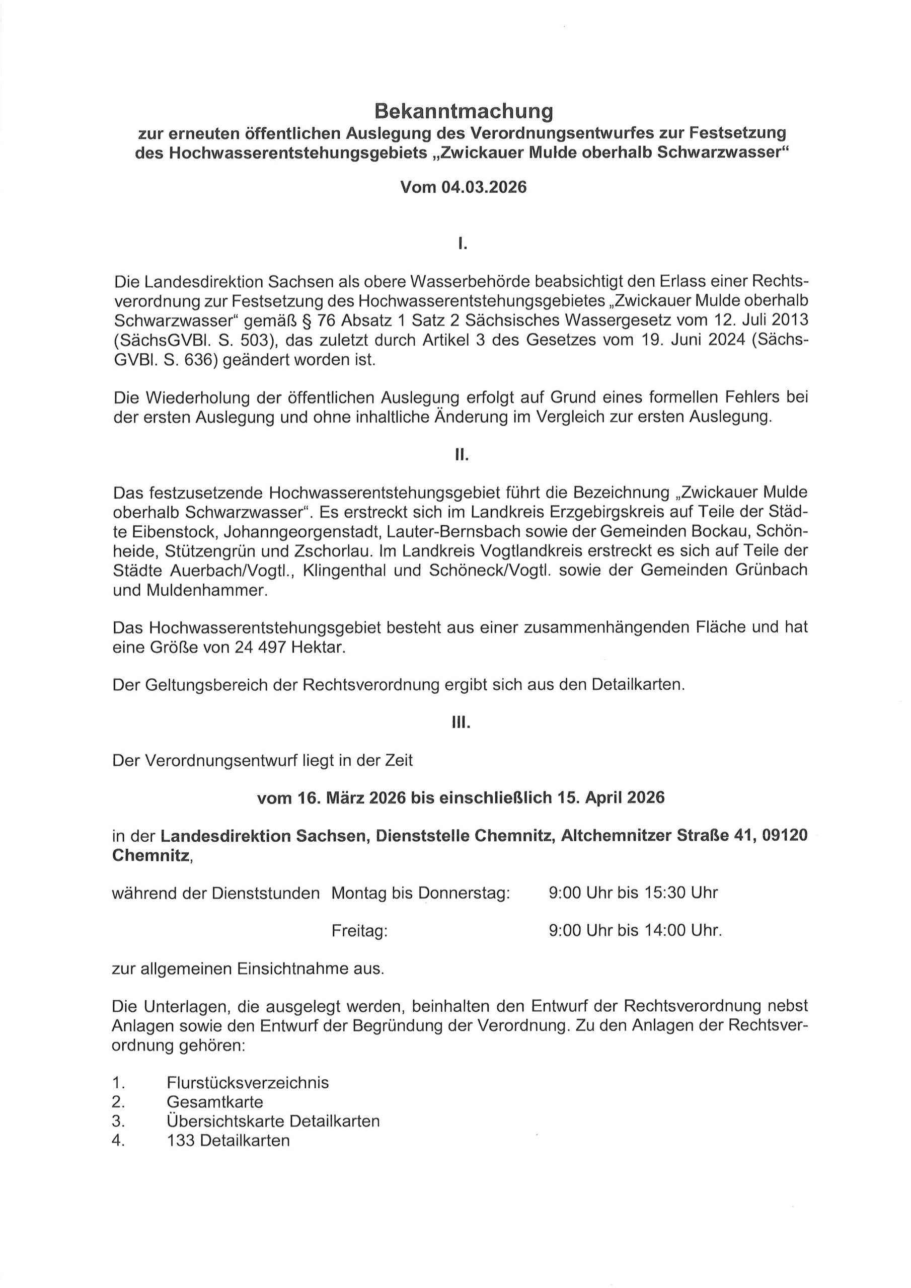 Auslegung des Verordnungsentwurfes zur Festsetzung des Hochwasserentstehungsgebiets Zwickauer Mulde oberhalb Schwarzwasser