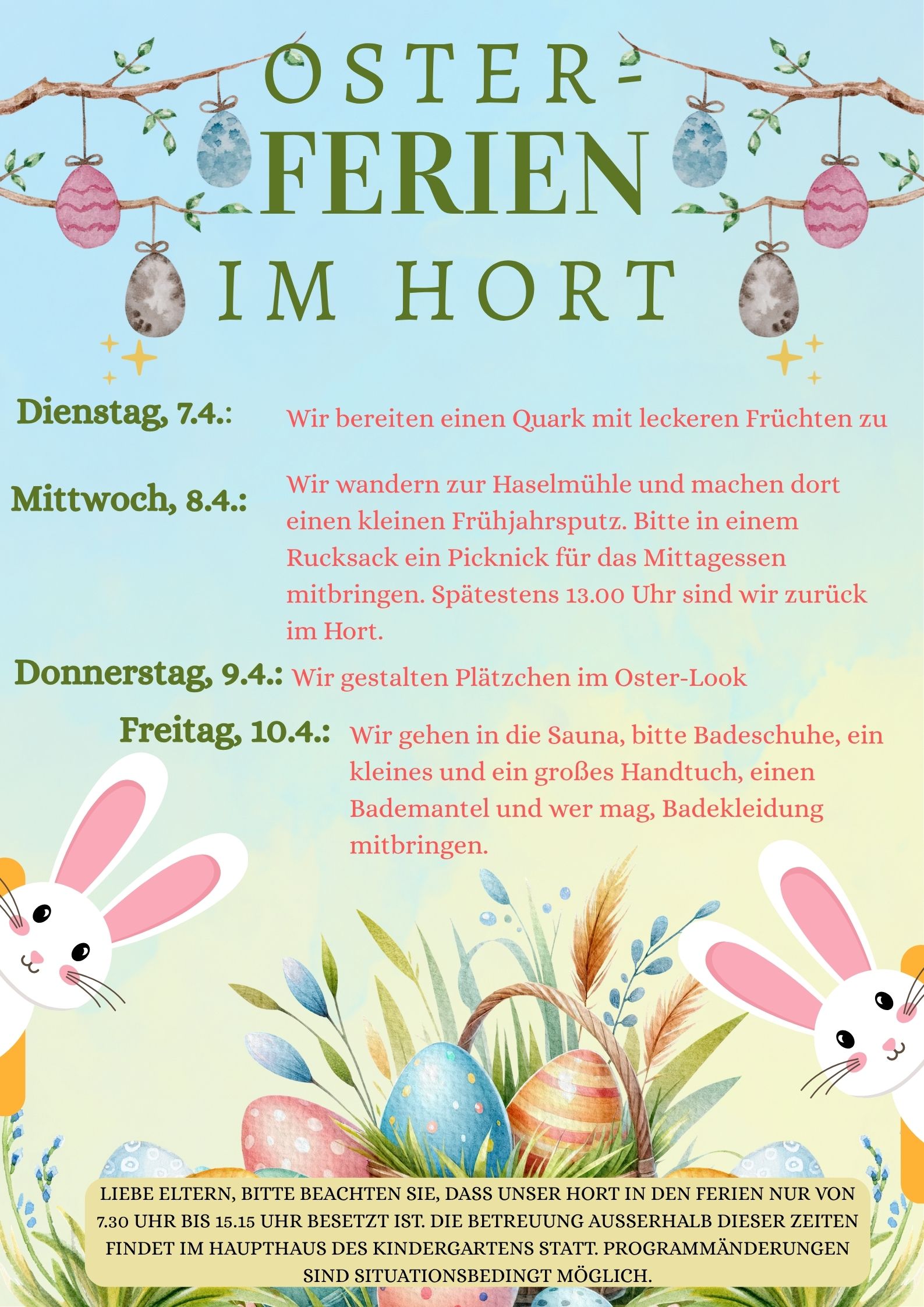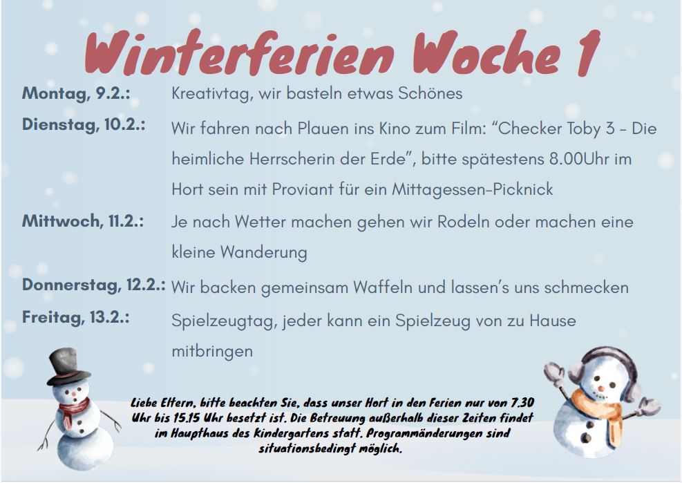 Unsere Kindertagesstätte ist werktags von 6.00 – 17.00 Uhr geöffnet. Die tägliche Betreuungszeit wird nach Stunden gestaffelt angeboten und kann monatlich geändert werden. Weiterhin haben die Kinder die Möglichkeit, in unserer Einrichtung Mittag zu essen.